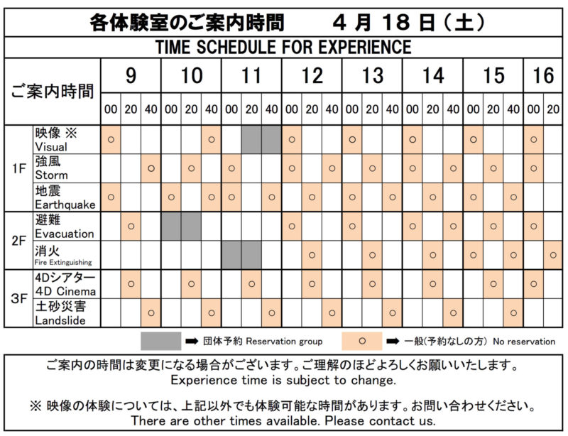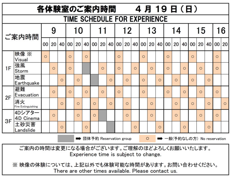 令和8年4月18日(土)及び19日(日)の防災体験コーナーの体験時間割表